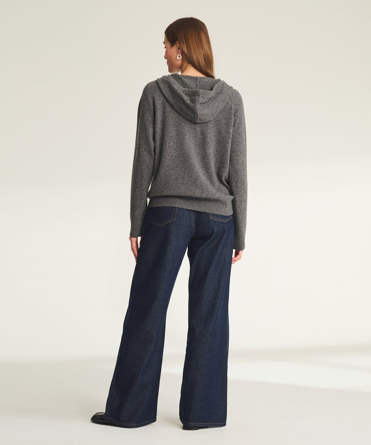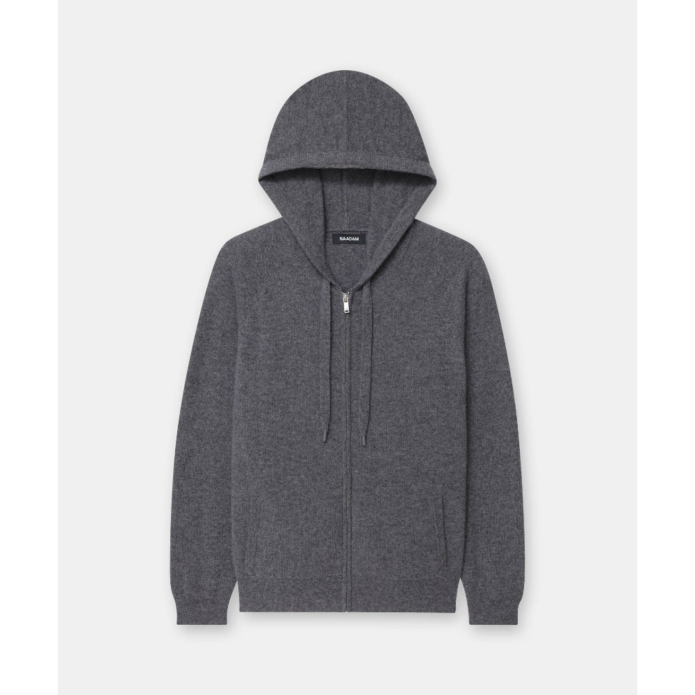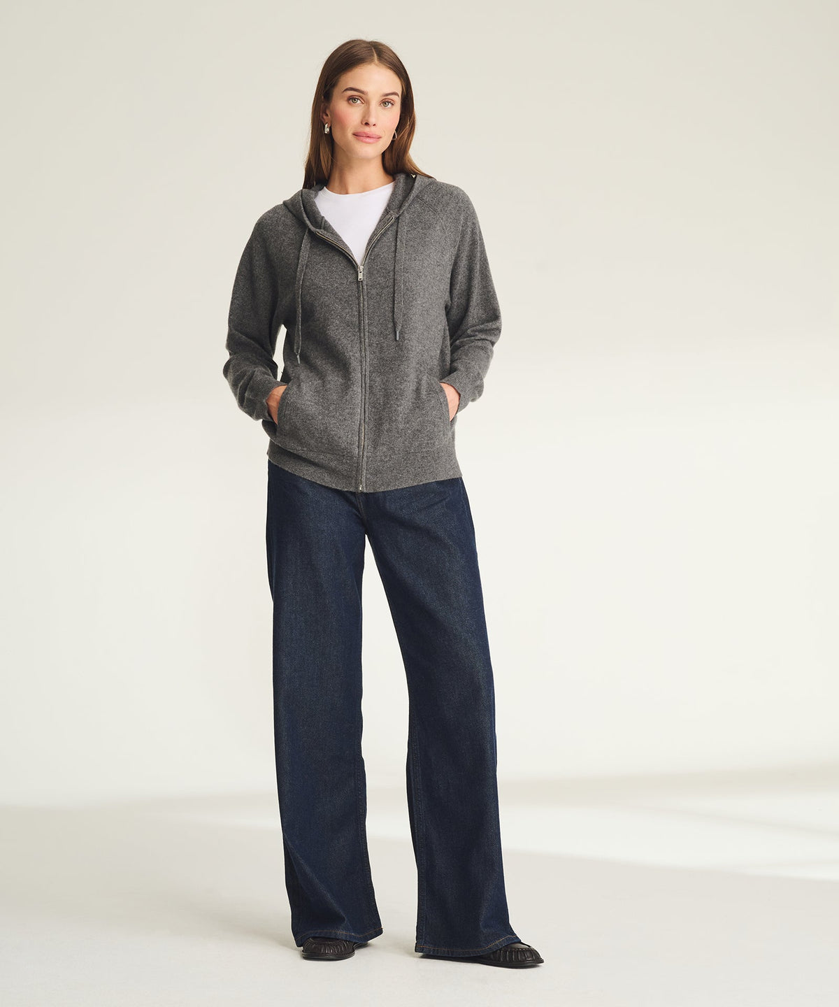 The Cashmere Zip Up Hoodie is an elevated essential with a relaxed classic fit and long classic length designed to sit comfortably at the center of the hips. It features a drawstring hood, front pockets, ribbed details, and full-zip construction.